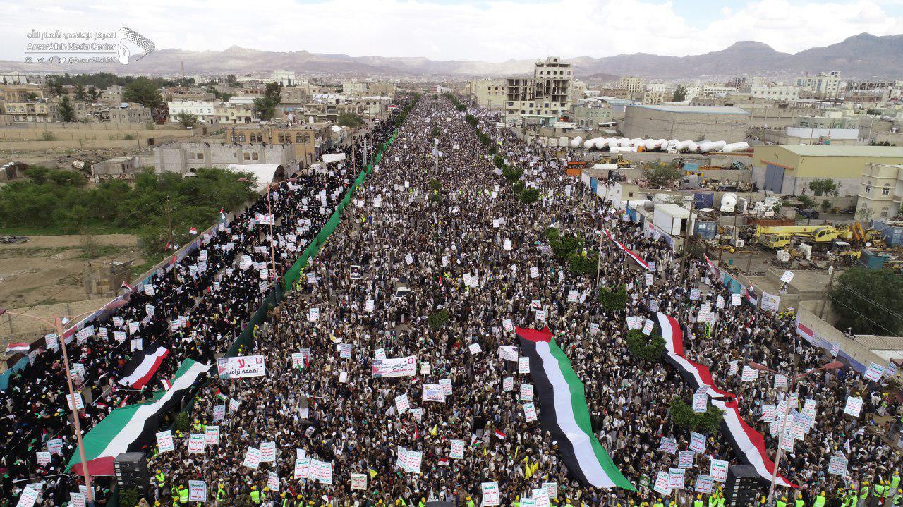 ويتقاطر المواطنون من مختلف مديريات أمانة العاصمة صنعاء، ومن المديريات المحيطة بالعاصمة حاملين أعلام الجمهورية اليمنية وأعلام فلسطين ولافتات الحرية المناهضة للسياسة الأمريكية في المنطقة، وصورا لقائد الثورة السيد عبدالملك بدرالدين الحوثي، وصورا لقادة المقاومة في المنطقة.