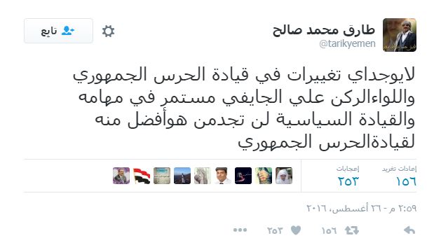 وقال العميد طارق محمد صالح في تغريدة على موقع التواصل الإجتماعي “التويتر” : “لا يوجد اي تغييرات في قيادة الحرس الجمهوري” مضيفاً “واللواء الركن علي الجايفي مستمر في مهامة والقيادة السياسية لن تجدمن هو أفضل منه لقيادةالحرس الجمهوري”