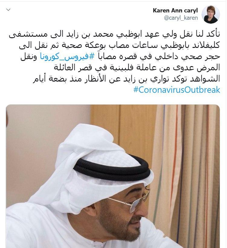 فيما أكدت الباحثة الأمريكية المختصصة في الشأن الخليجي “كارين آن كاري” نقل ولي عهد ابوظبي محمد بن زايد الى مستشفى كليفلاند بابوظبي ساعات مصاب بوعكة صحية ثم نقل الى حجر صحي داخلي في قصره مصاباً بفيروس كورونا.