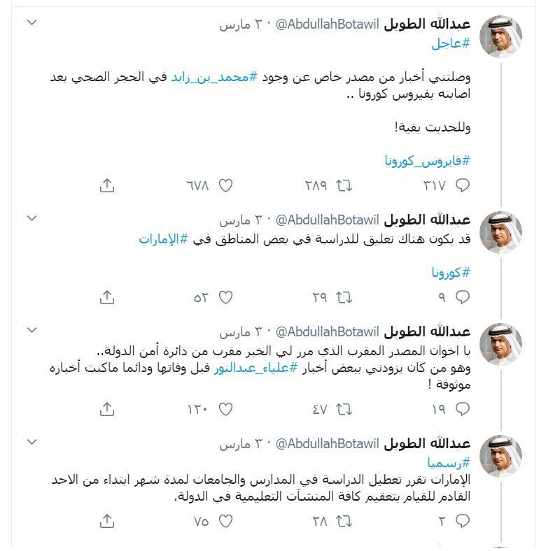 في السياق نقل الناشط الحقوقي الإماراتي البارز عبدالله الطويل، عن مصدر خاص قوله: (وصلتني أخبار من مصدر خاص عن وجود #محمد_بن_زايد في الحجر الصحي بعد اصابته بفيروس كورونا )، وهو الامر الذي تتكتم عليه السلطات الإمارات ولم تخرج في بيان رسمي لغاية اللحظة.