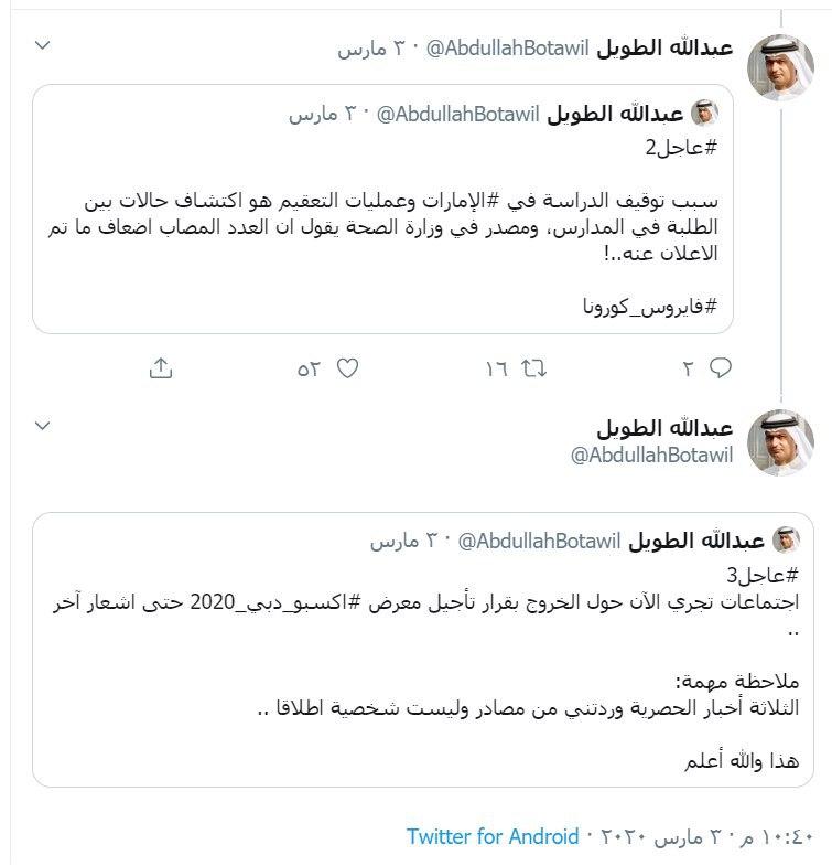 وفي تفاصيل أكثر كما يقول الطويل في سلسلة تغريدات كشفت ما يجري في الإمارات، فإن سبب توقيف الدراسة في الإمارات، وعمليات التعقيم جاءت بعد اكتشاف حالات بين الطلبة في المدارس، مشيراً إلى أن مصدر في وزارة الصحة الإمارات كشف له ان أعداد المصابين اضعاف ما تم الاعلان عنه..!