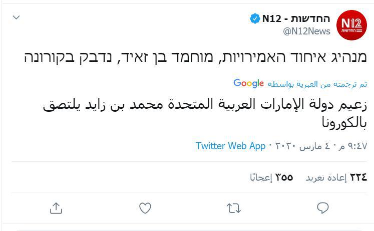وقالت القناة الـ 12 العبرية أن ولي عهد أبو ظبي محمد بن زايد أصيب بفيروس كورونا، دون أن تشير لمزيد من التفاصيل.