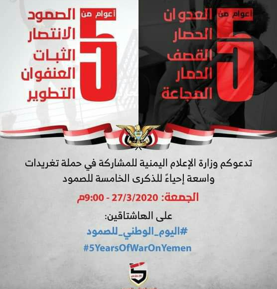 ودعت وزارة الإعلام المنظمة للحملة الجميع للمشاركة الفاعلة على هاشتاقات الحملة #اليوم_الوطني_للصمود #5YearsOfWarOnYemen.
