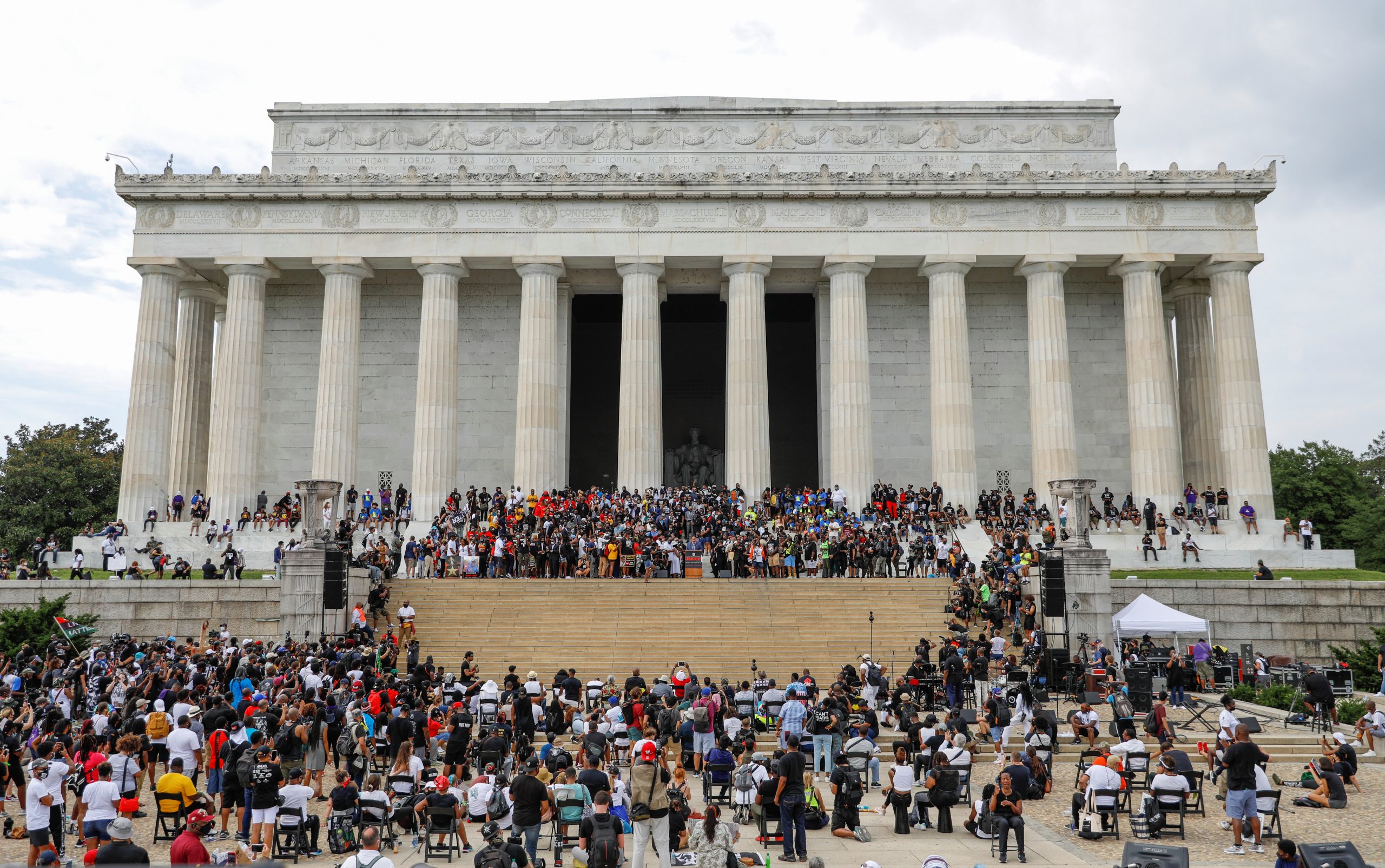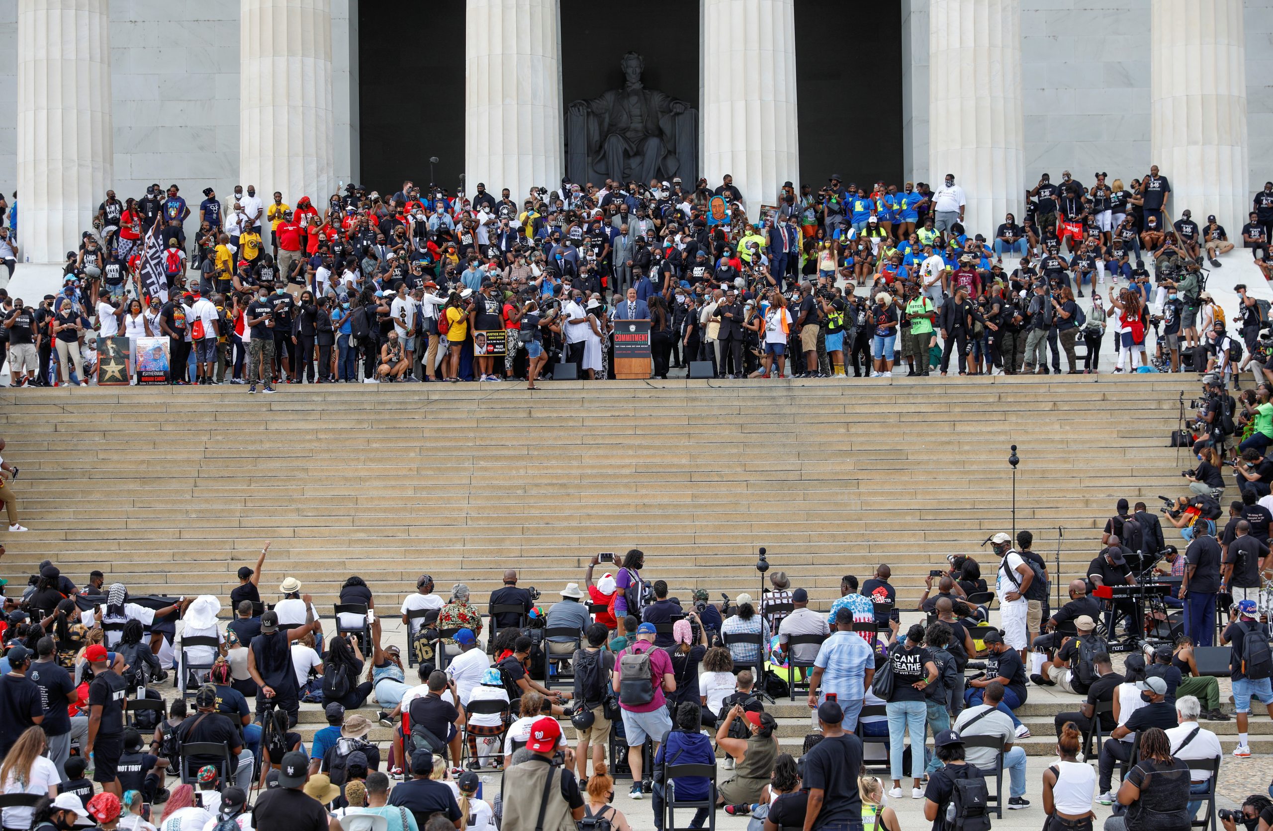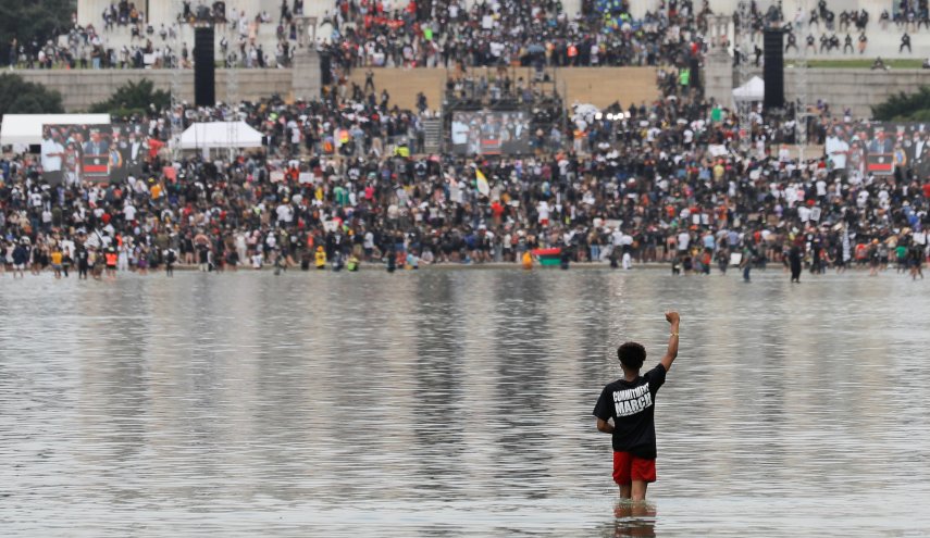 وهتفت الحشود، تحت عنوان “أبعد قدمك عن أعناقنا”، في إشارة إلى الطريقة التي قُتل بها جورج فلويد أثناء احتجازه من قبل الشرطة الأمريكية، في شهر مايو الماضى، وتذكيرا بأحداث مارس عام 1963، في واشنطن.