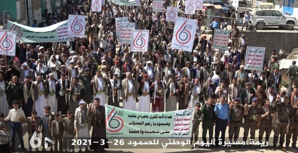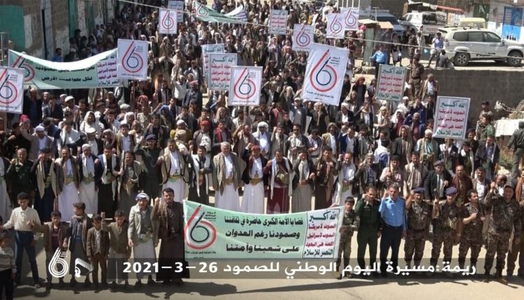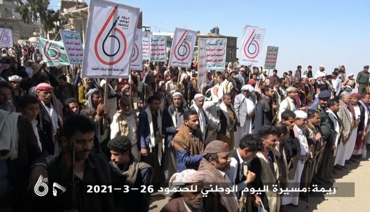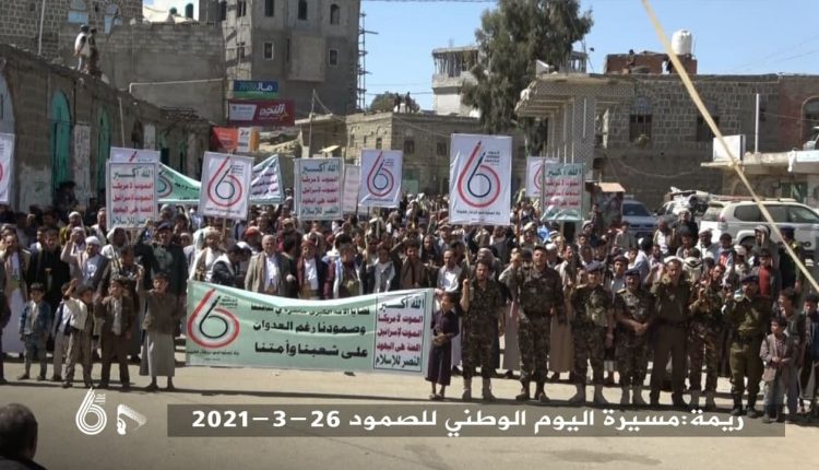 شهدت محافظة ريمة اليوم مسيرة جماهرية حاشدة وفعالية خطابية، لإحياء ذكرى مرور ستة أعوام من الصمود في وجه العدوان وتدشيناً للعام السابع. استنكروا فيها استمرار العدوان الأمريكي السعودي والحصار على الشعب اليمني منذ ست سنوات، مؤكدين أن استمرار العدوان وحربه الاقتصادية المتصاعدة لن يثني الشعب اليمني عن مواصلة الدفاع عن الوطن وسيادته واستقلاله.