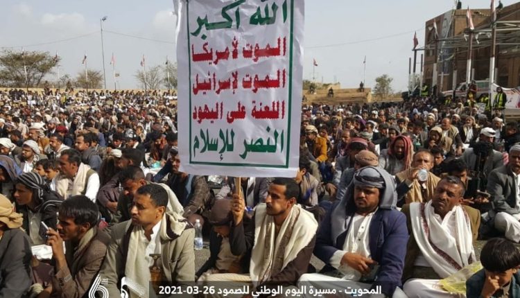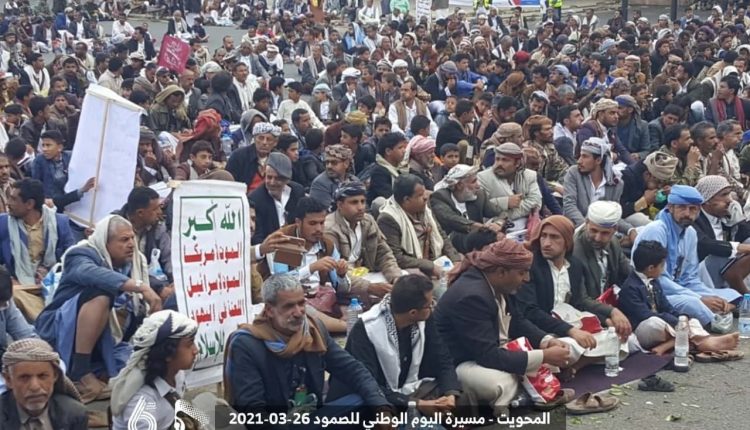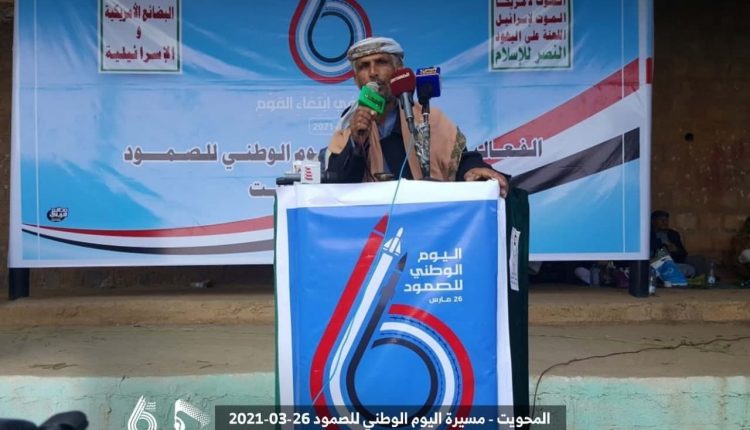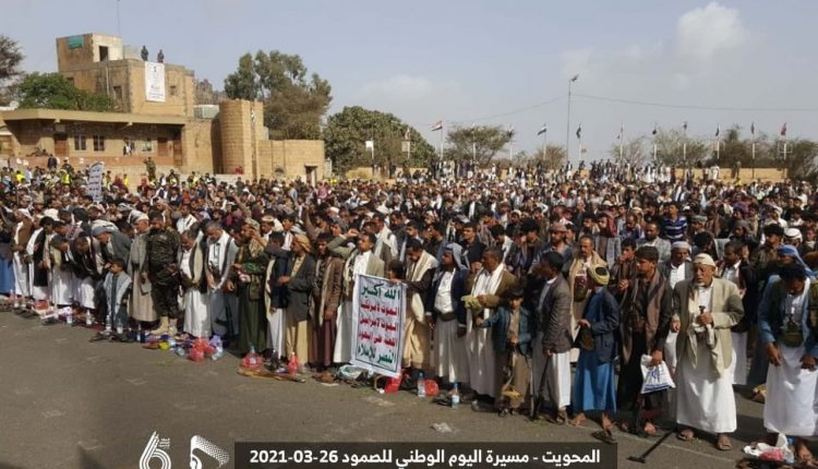 وطالب بيان صادر عن المسيرة الجماهيرية كافة القوى السياسية والوطنية وجماهير الشعب اليمني بمزيد من الاصطفاف والتلاحم لتعزيز الصمود والثبات في العام السابع ومواجهة صلف وغطرسة العدوان وحصاره.. مؤكدا إصرار أبناء المحويت على المضي في مواجهة العدوان واستمرار رفد الجبهات بالرجال والمال والعتاد .. معبراً عن الاعتزاز بالانتصارات التي يحققها أبطال الجيش واللجان الشعبية في الجبهات لردع العدوان والكف عن غطرسته.