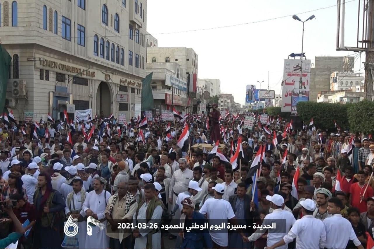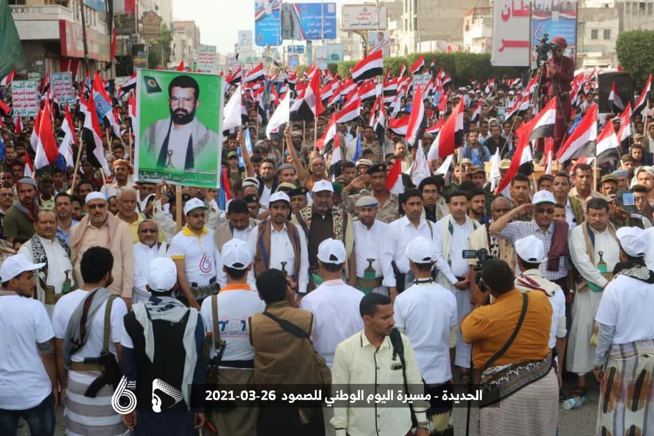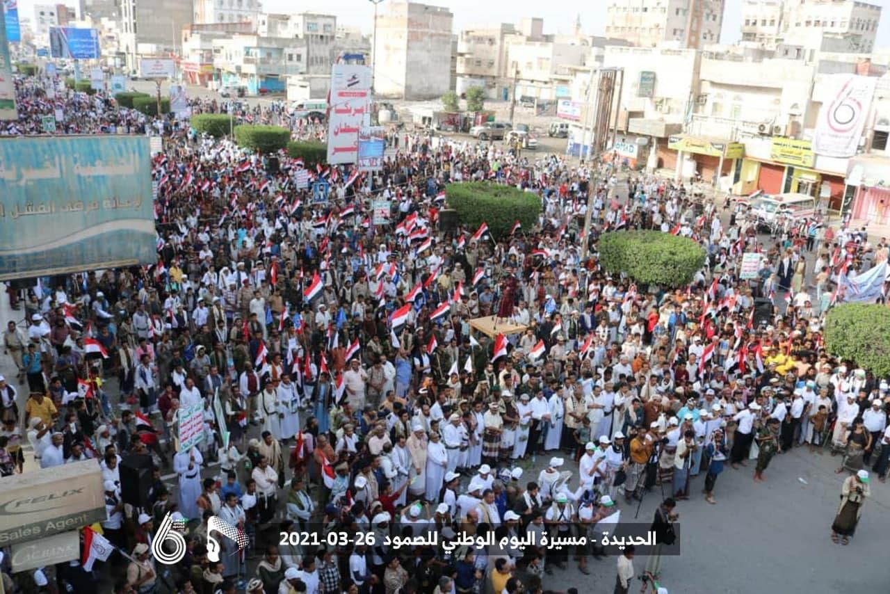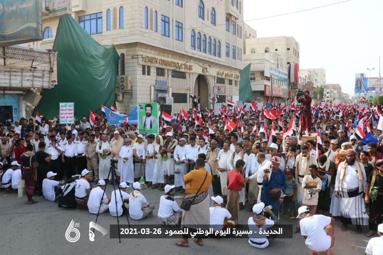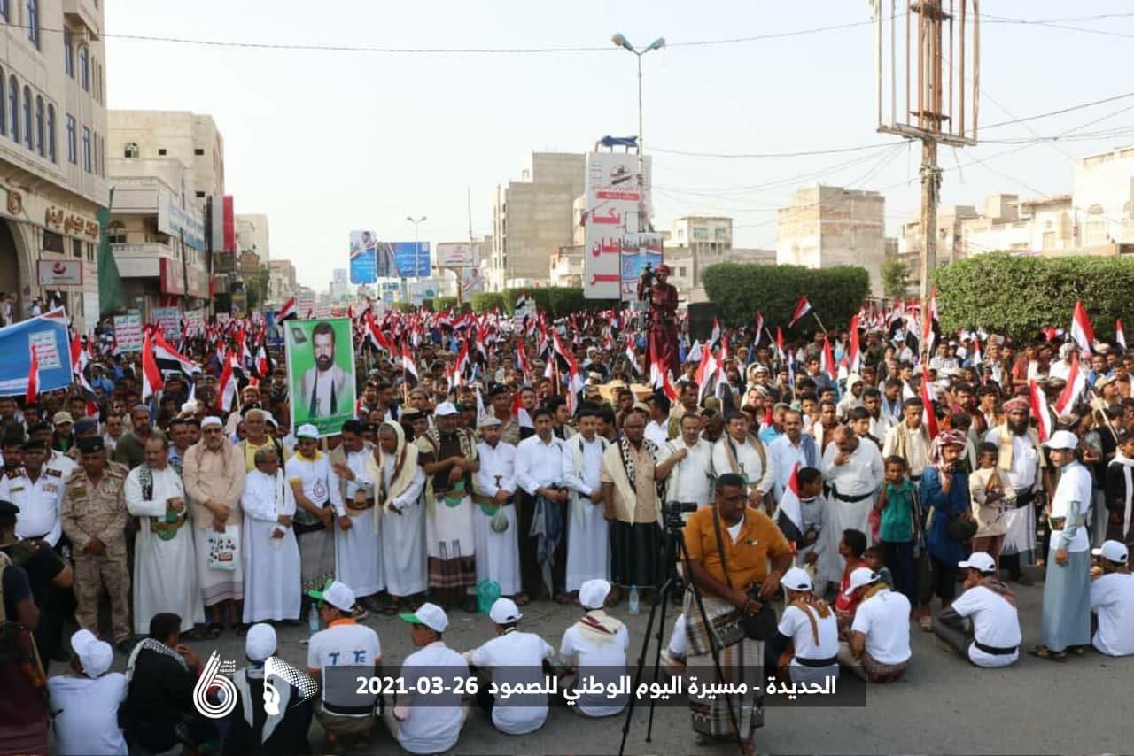 هذا وأكد القائم بأعمال المحافظ محمد عياش قحيم في مسيرة جماهيرية حاشدة وفعالية خطابية، بمحافظة الحديدة بيوم الصمود الوطني وتدشينا للعام السابع من الصمود في وجه العدوان، المضي مع القيادة الثورية في مواجهة العدوان وإفشال مخططاته التي تستهدف اليمن أرضاً وإنساناً.
