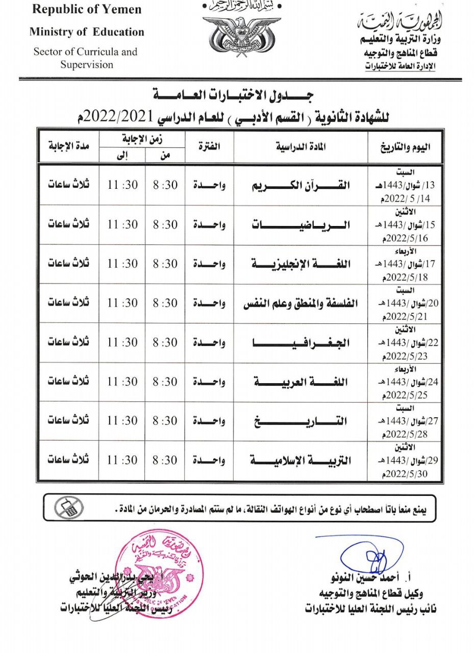كما نشرت جدول الاختبارات العامة للشهادة الثانوية العامة (القسم الأدبي ) للعام الدراسي 2021- 2022م