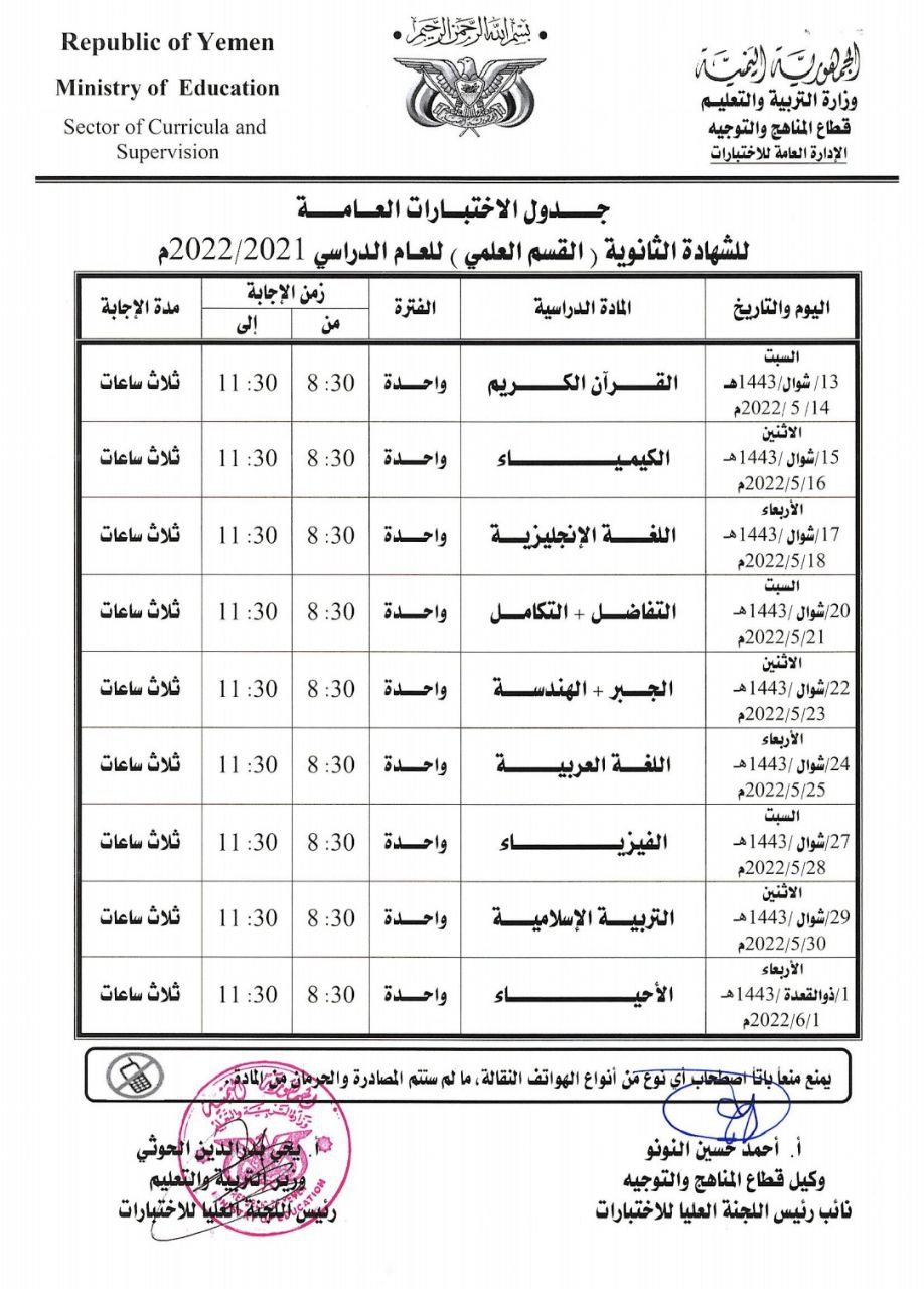 ونشرت الوزارة جدول الاختبارات العامة للشهادة الثانوية العامة (القسم العلمي) للعام الدراسي 2021- 2022م.