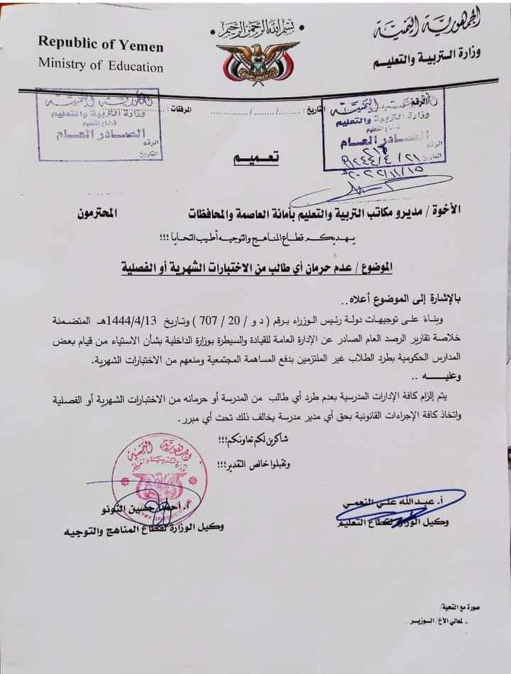 اصدرت وزارة التربية والتعليم تعميم جديد بشان الاختبارات وضرورة حضور جميع الطلاب وعدم حرمان اي طالب منها.