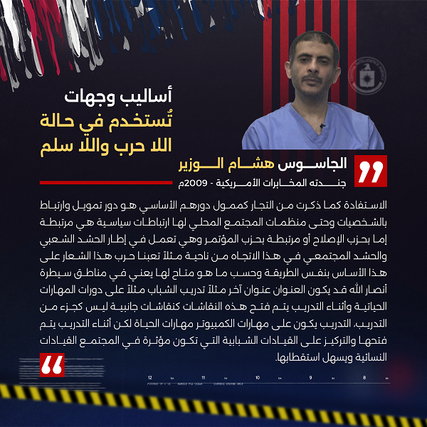 أورد الجاسوس ضمن شبكة التجسس الأمريكية الإسرائيلية هشام الوزير بعضاً من تفاصيل المؤامرة الأمريكية ضد “أنصار الله”.