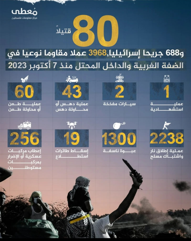 ووفق التقرير الإحصائي، فقد نفّذت المقاومة الفلسطينية 3968 عملية نوعية خلال العامين الماضيين، أسفرت عن مقتل 80 إسرائيلياً وإصابة 688 آخرين، في مؤشر واضح على اتساع رقعة الفعل المقاوم رغم القبضة الأمنية الإسرائيلية والحصار المفروض على غزة.