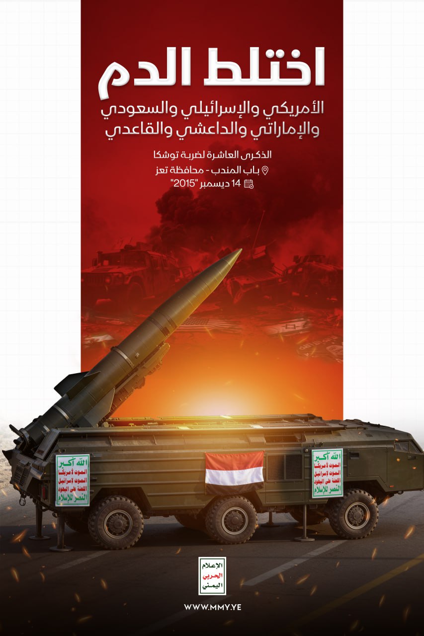 نشر الإعلام الحربي اليمني مساء اليوم الأحد 14 ديسمبر 2025م، الموافق 23 جمادى الآخرة 1447 هجرية، صورة لبوستر يحاكي ما حدث خلال هذا التاريخ قبل عشرة أعوام. وتضمن البوستر تذكير بعملية استهداف شعب الجن في باب المندب بمحافظة تعز بصاروخ توشكا خلف عشرات القتلى بينهم مرتزقة أمريكيين وإسرائيليين بالإضافة لقتى سعوديين وإماراتيين، وعقب تلك الضربة غادرت شركات أمنية للمرتزقة منها داين كروب وبلاك ووتر مسرح العمليات اليمني.