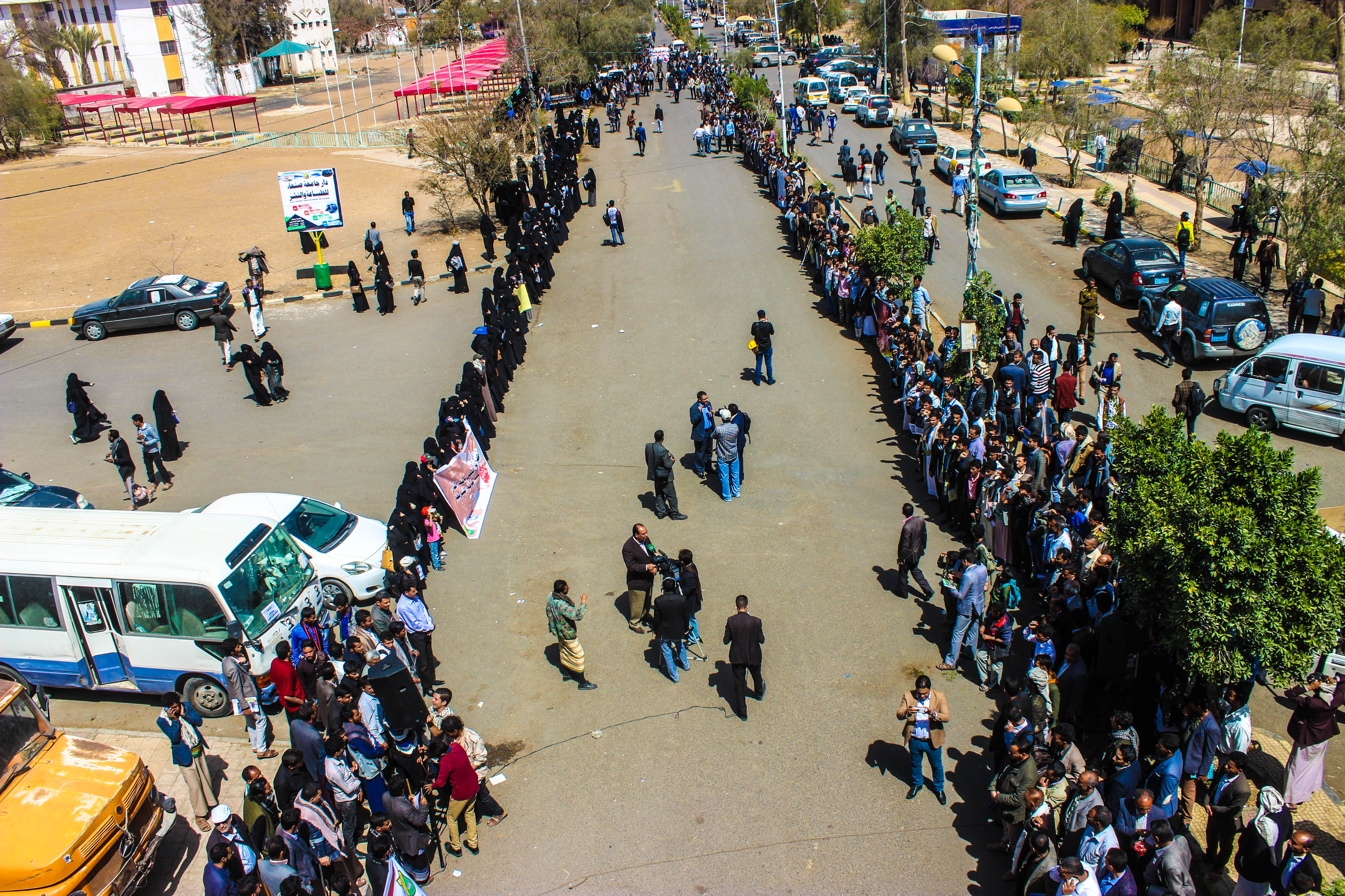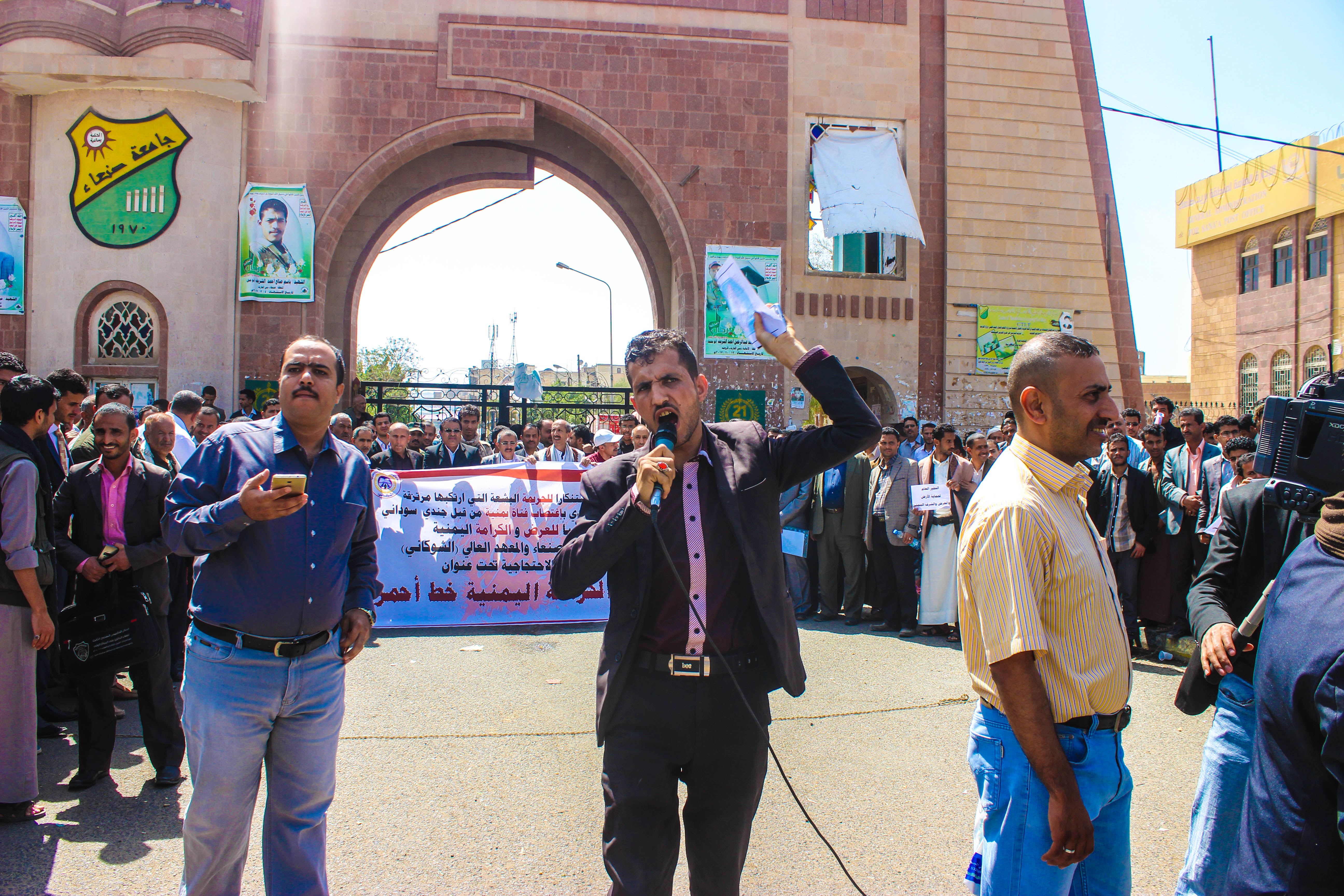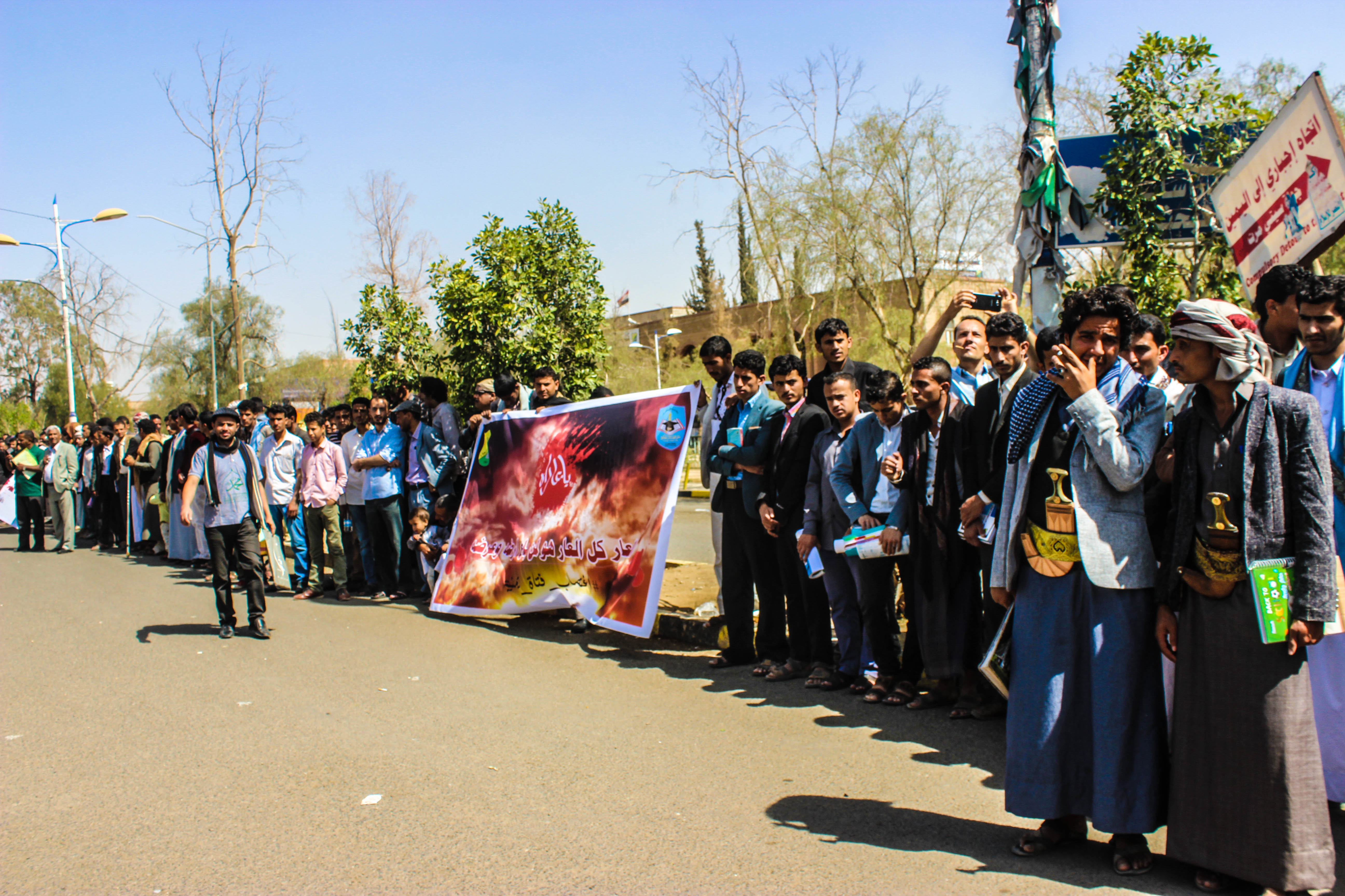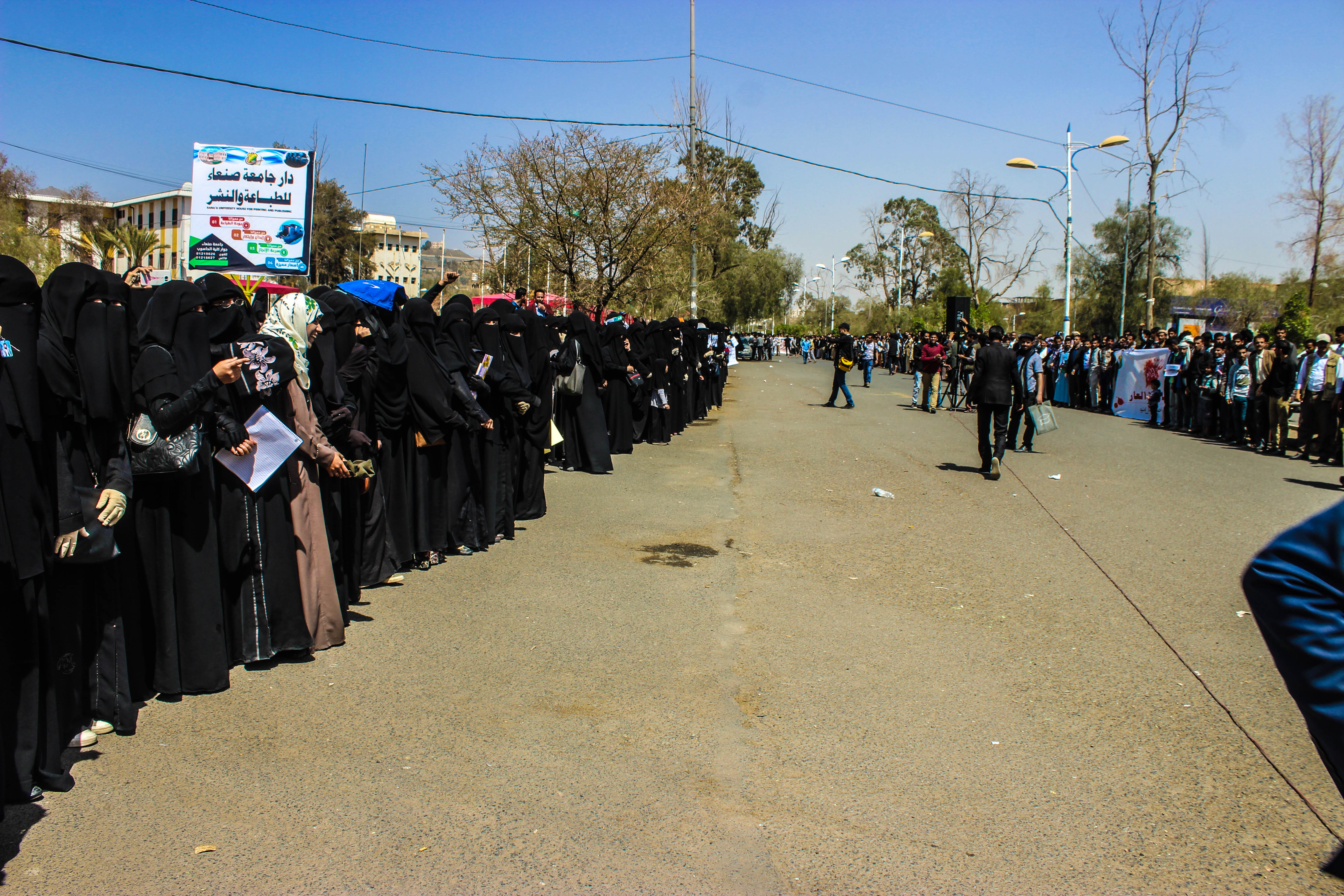 في وقفة إحتجاجية كبيرة أدانت جامعة صنعاء جريمة اغتصاب أحد مرتزقة العدوان لامرأة في مديرية الخوخة بمحافظة الحديدة.
