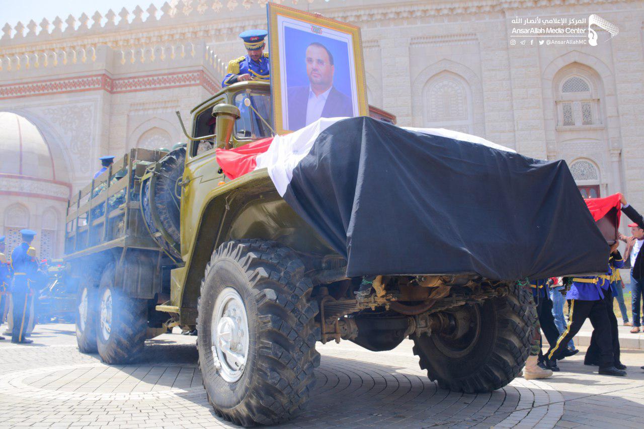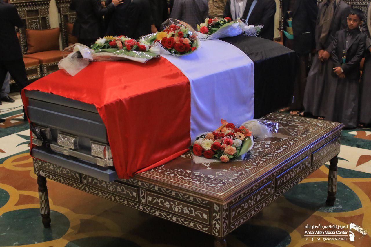 جرت مراسيم التشييع الرسمي بعد الصلاة على جثامين الرئيس الشهيد صالح الصماد ورفاقه بجامع الشعب، الذين لفت جثامينهم بالعلم الجمهوري، حيث سار موكب التشييع يتقدمه سرايا رمزية من القوات المسلحة والأمن، في حين كانت الموسيقى العسكرية تعزف الألحان الجنائزية في موقف جسد معاني الإعزاز والإكبار لتضحيات الرئيس الشهيد صالح الصماد وكل شهداء الوطن الذين قدموا أرواحهم رخيصة في سبيل الدفاع عن الأرض والعرض في مواجهة قوى الغزو والعدوان.