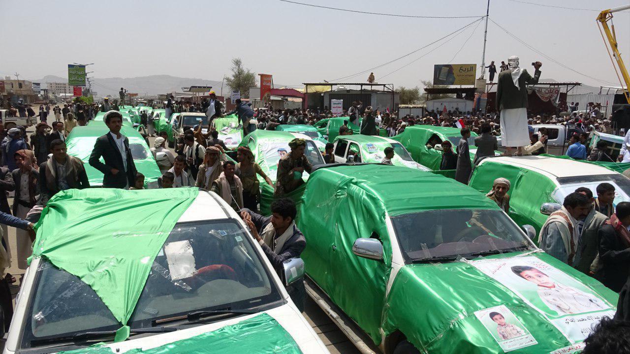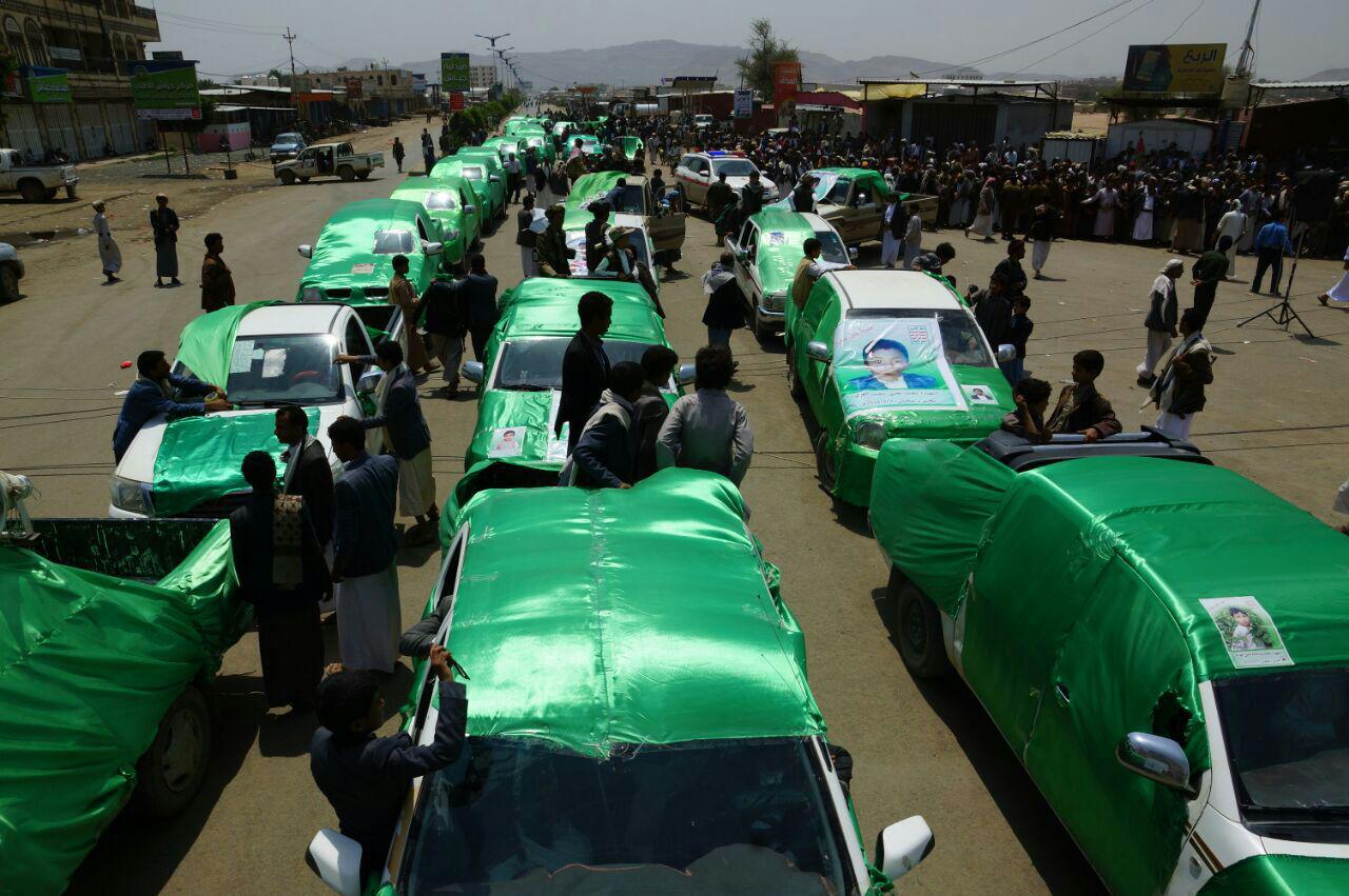 وبعد كلمة رئيس اللجنة الثورية العليا نقلت ما يقارب من خمسين سيارة اكتست بقماش بالون الأخضر جثامين الشهداء ليتوارى الشهداء في مسقط رأسهم بمدينة ضحيان وهي المدينة التي ارتكبت فيها طائرات العدوان الجريمة المروعة.